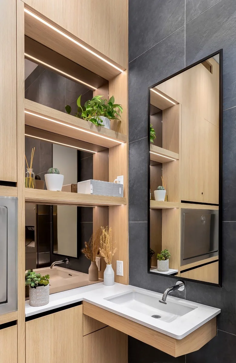 The custom reception drew inspiration from Scarbrough bluffs - an area significant to the client. The angular design incorporates stone and light wood, creating a contrast that’s elevated by lighting. Overall the design incorporates wood, glass, concrete tiles and black metal accents, which crafts coherence between clinic’s branding and the space.